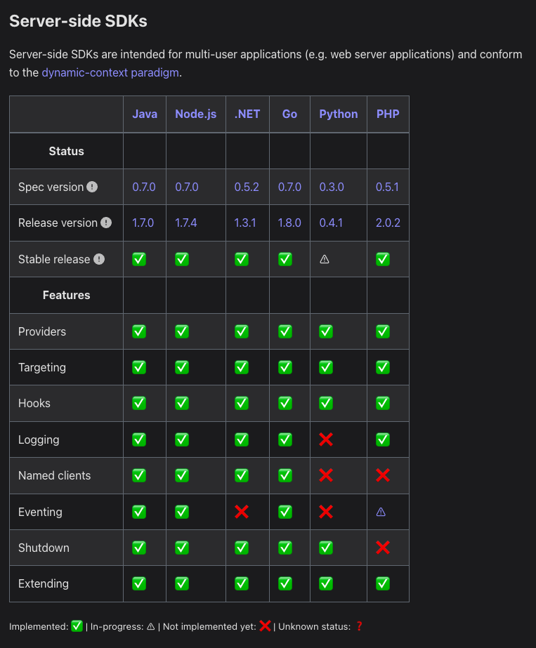 You can now see the status and supported features of the OpenFeature SDKs in a simplified visual matrix for both Server-side and Client-side SDKs. Check it out here.